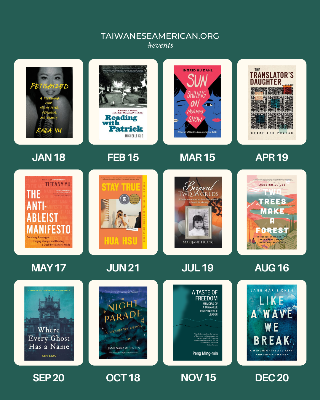 (1) Host your own reading group: At the conclusion of each month, we’ll post a community discussion guide for the selected text. We encourage forming your own reading groups (especially beyond the Taiwanese American community) and using these guides as a starting point for your own discussions!